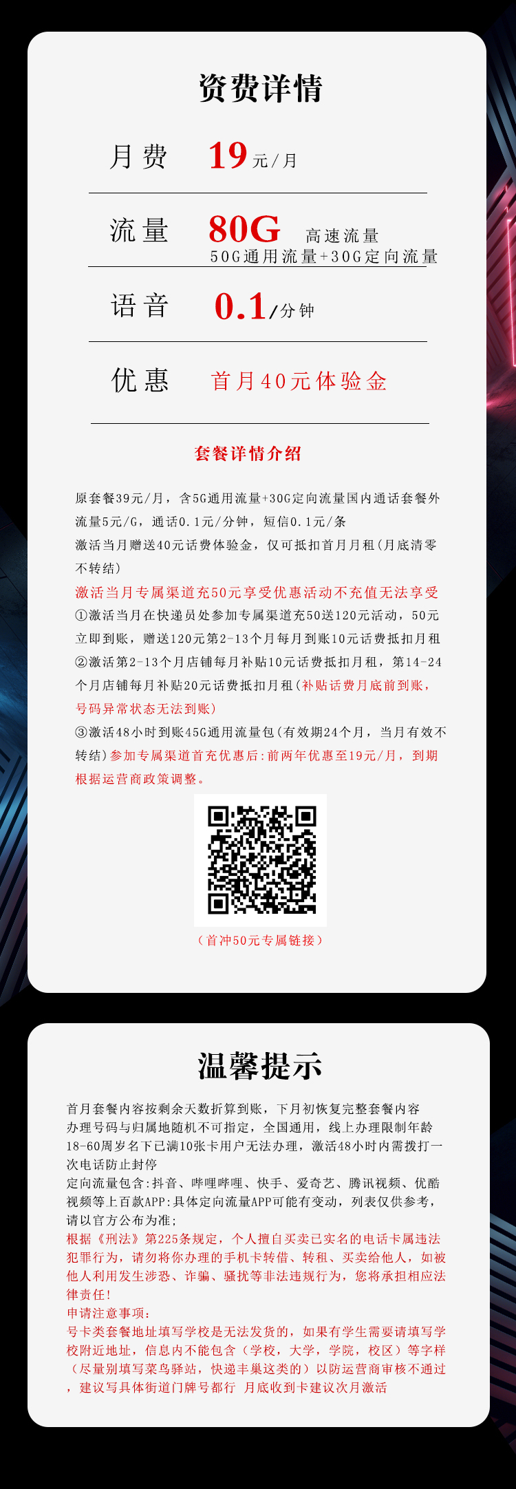 首月资费:首月赠送40元话费体验金,用来抵扣首页月租,以实现首月免月租