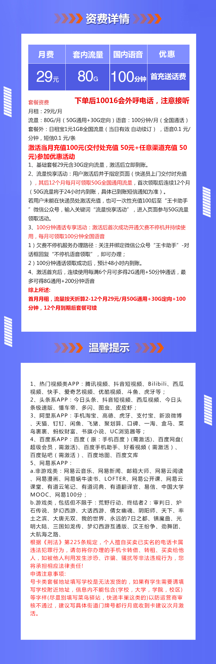 套餐信息:首月月租和流量按天折算,第2到12月月租29元,每月80G流量(50G通用+30G定向),每月100分钟免费拨打电话时长,拨打电话0.1元每分钟,发送短信0.1元每条,赠送来电显示,收货地就是归属地,可自选靓号。
